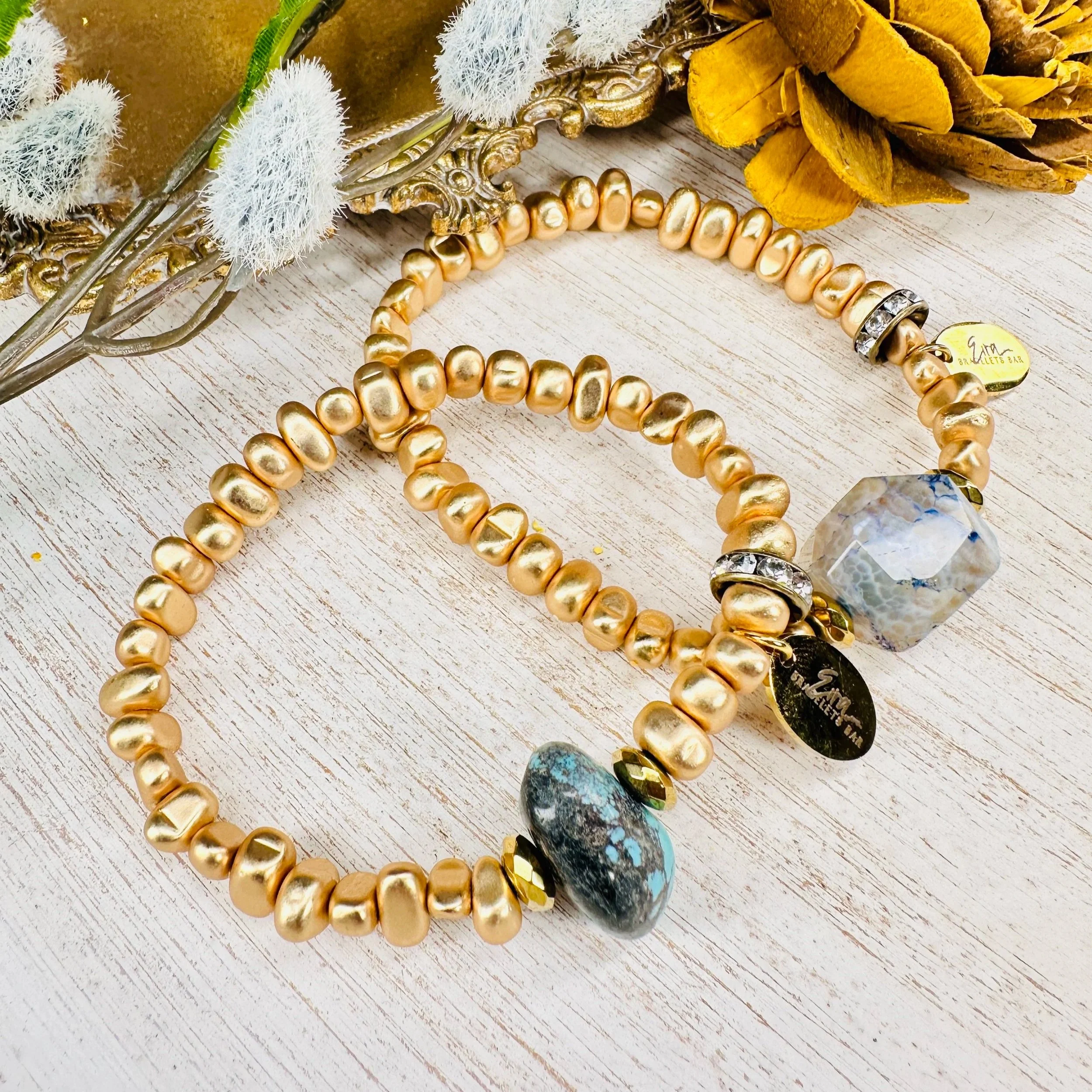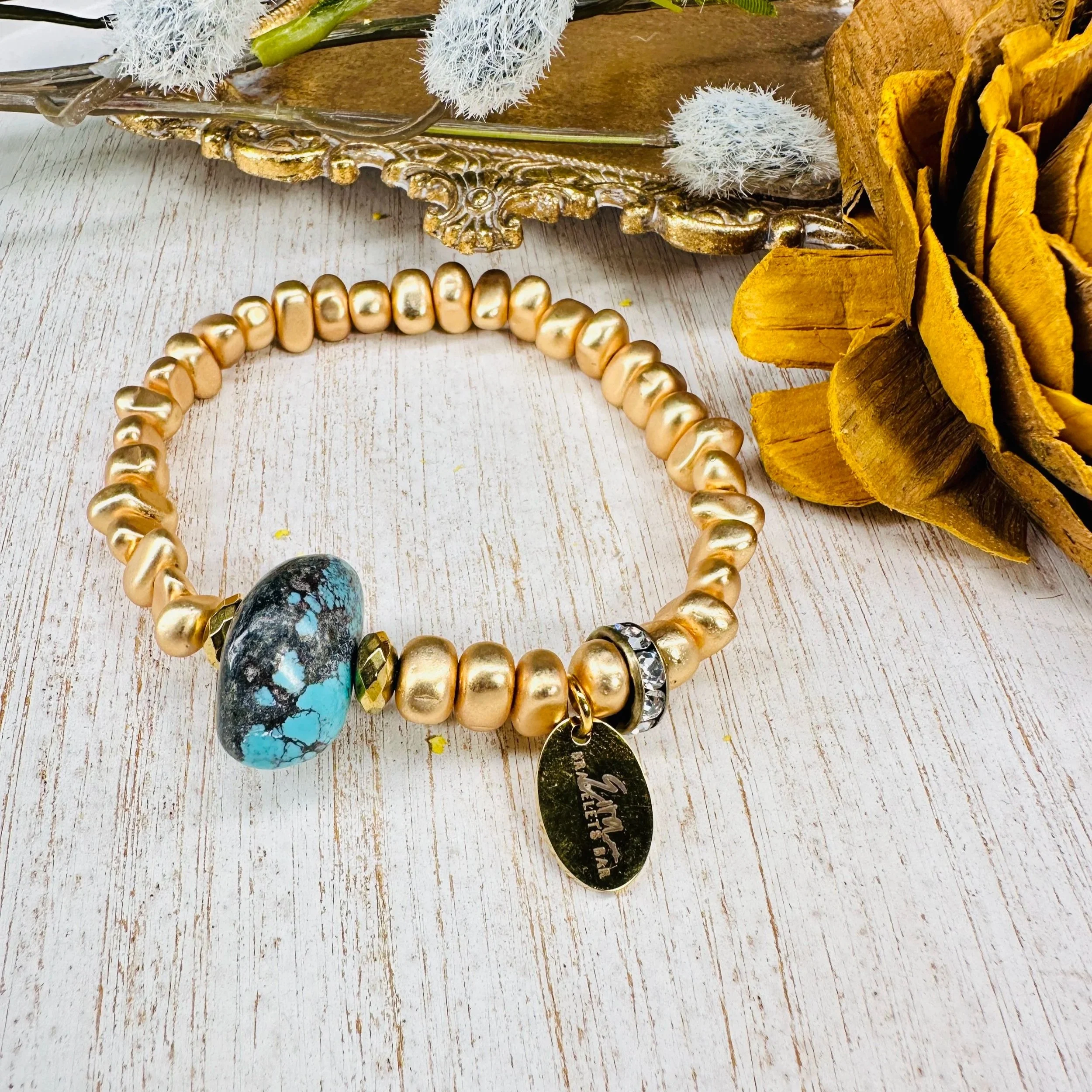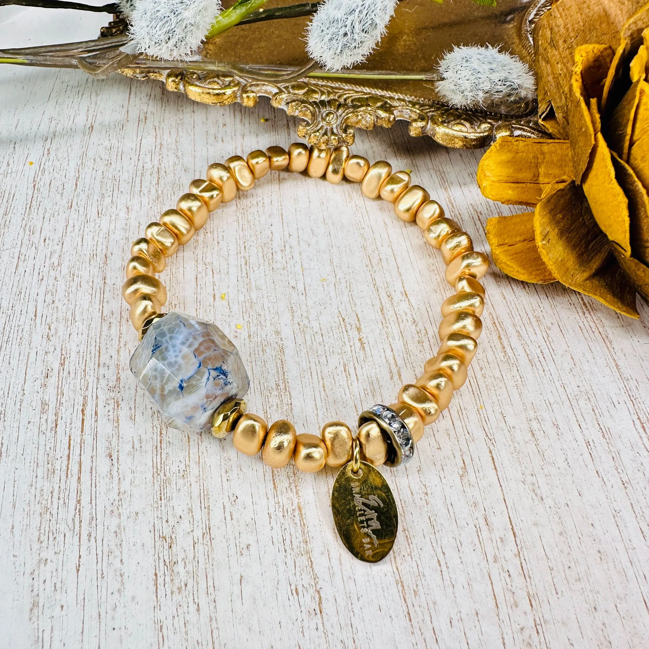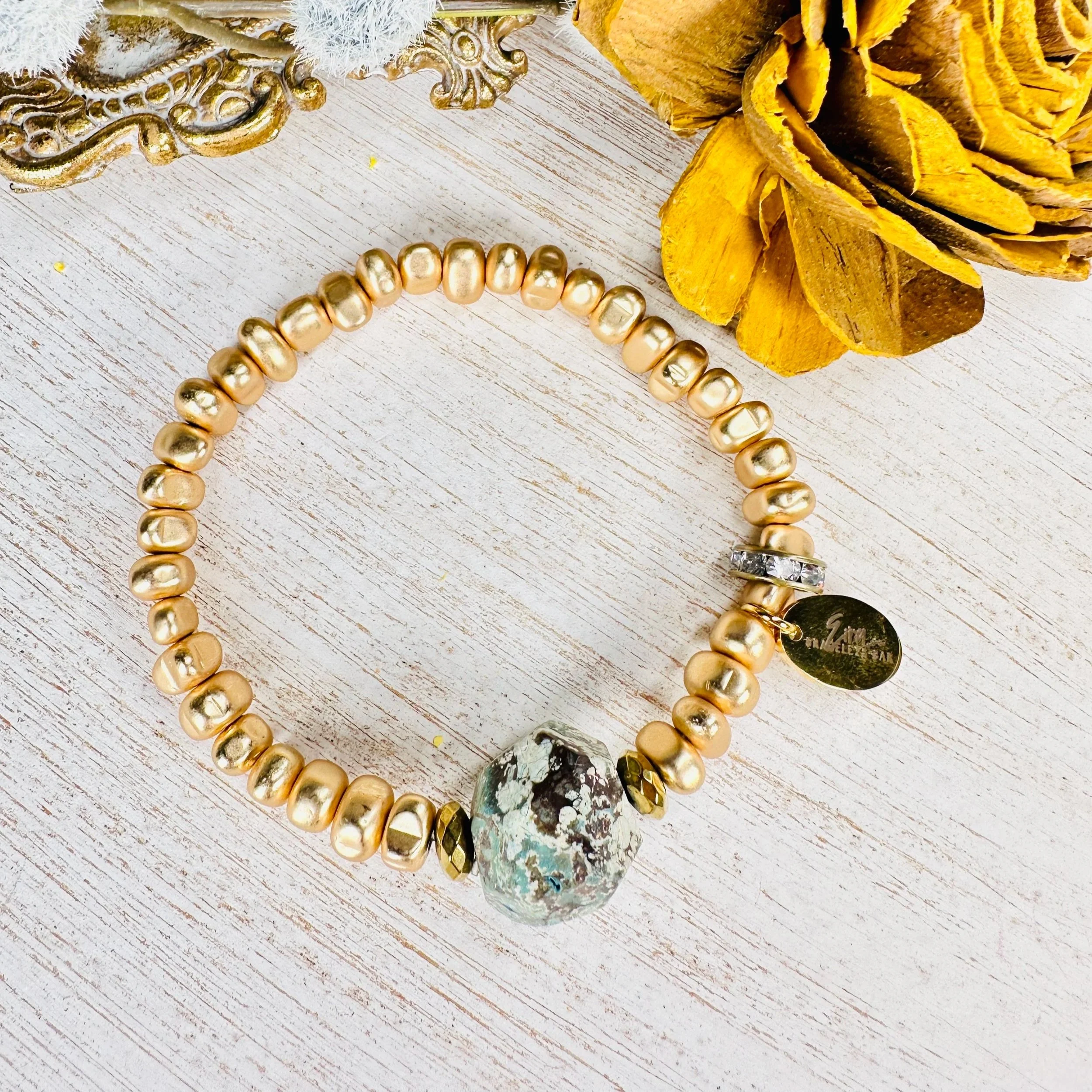 8mm matte gold faceted Hematite beads with gemstone bead in the middle/rhinestone spacer & Eira tag